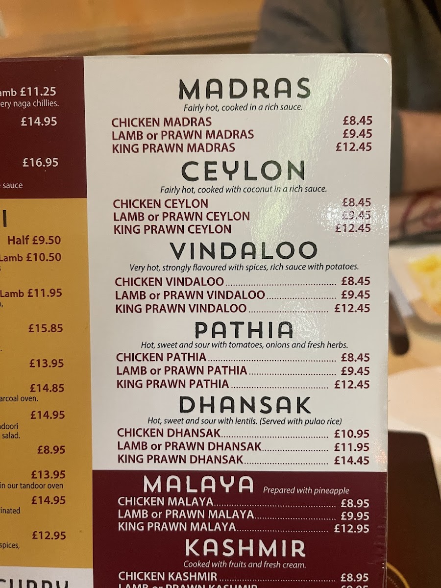 Very hot, strongly flavoured with spices, rich sauce with potatoes.